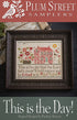 This Plum Street Sampler design features a brick house and flowers at the top and at the bottom, "This is the day that the Lord hath made. We will rejoice and be glad in it."